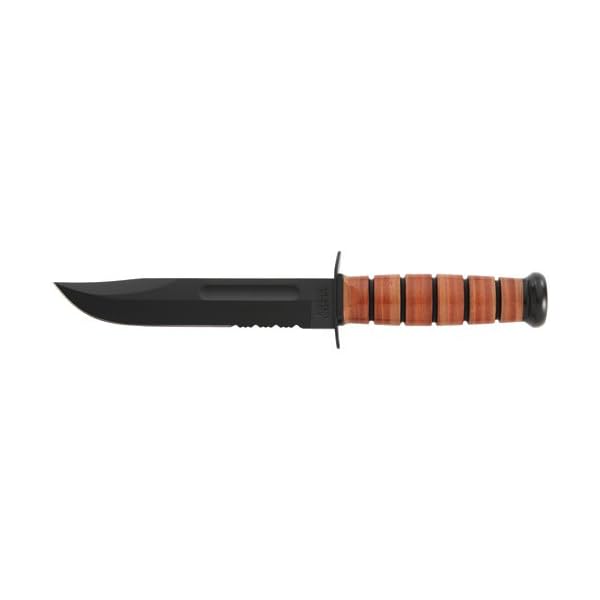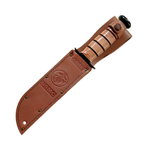 Famous in its own right with a historical background and a part of an American legend. 12″ overall. 7″ black epoxy powder covered partly serrated 1095 prime carbon steel blade with USMC tang stamp. Polished stacked leather Care for with black epoxy powder covered carbon steel guard and butt. Brown leather belt sheath with USMC brand.